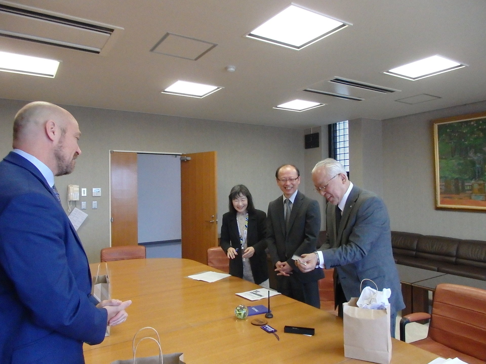 調印式には、本学からは、山下学長をはじめ、国際関係学部学部長、国際交流委員長の李暁東教授および国際コミュニケーションコース長の江口真理子教授が参加しました。イーストカロライナ大学からは学長補佐のジョン・レジック教授と、教育グローバル展開室長のジェイミー・リーボウィッツ教授が参加しました。終始和やかな意見交流が行われ、記念品として本学からは石見焼のコーヒーカップ、イーストカロライナ大学からは大学所有のガラス工房で作られたクリスタルの置物が贈られました。