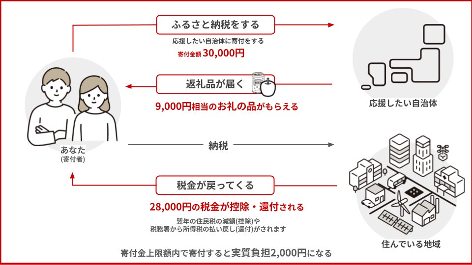 寄付金のうち2,000円を超える部分については、あなたが住む地域の住民税の減額(控除)や税務署から所得税の払い戻し(還付)を受けられます。