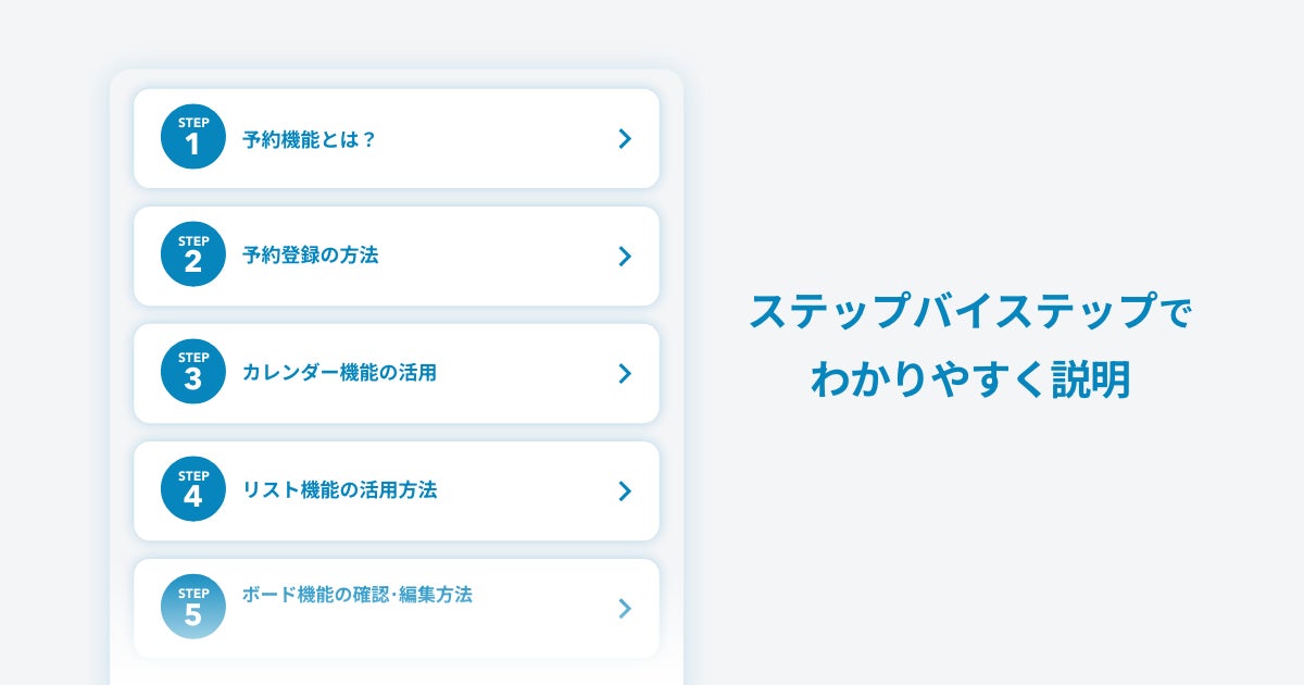 「cars MANAGER」に搭載された豊富な各スマート機能を紹介し、実装方法までを丁寧に解説した使い方ガイドをご用意。スマート予約など、各機能の操作手順をステップバイステップでわかりやすく説明しています。