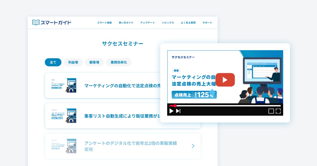 「cars MANAGER」のスマート機能を活用し、「利益増」「顧客増」「業務効率化」を実現した成功事例やノウハウを分かりやすい動画セミナーで常時開催中。