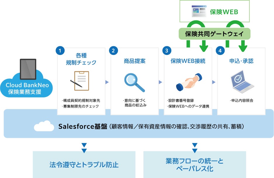 本システムは、金融機関のお客様へ保険商品を販売する際に必要なコンプライアンスチェックから、保険共同ゲートウェイへの接続を実現します。