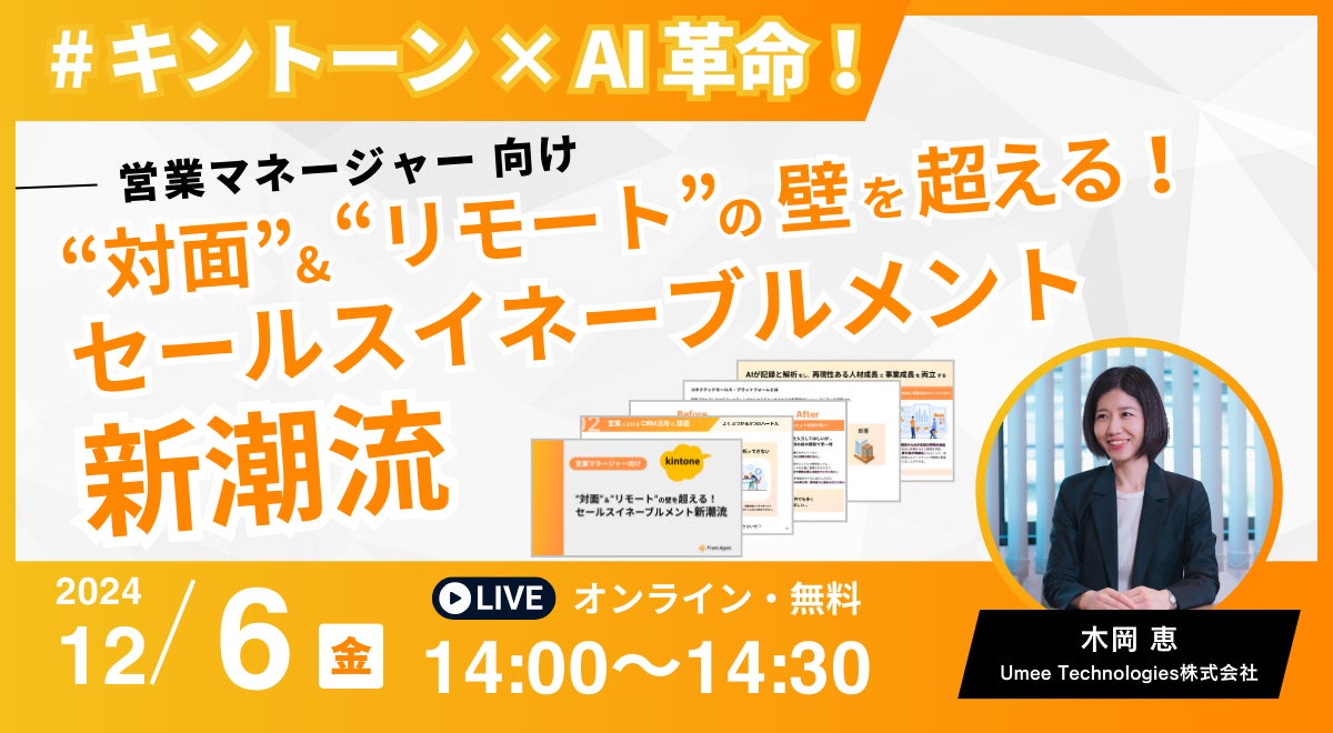 新人からトップセールスを輩出するコネクテッドセールス・プラットフォーム*「Front Agent」を開発・提供するUmee Technologies株式会社(本社:東京都調布市、代表取締役:新納 弘崇、以下「ユミー」)は、12月6日(金)14:00 - 14:30にオンラインセミナー「キントーン×AIで”対面”&”リモート”の壁を超える!セールスイネーブルメント新潮流」を開催いたします。