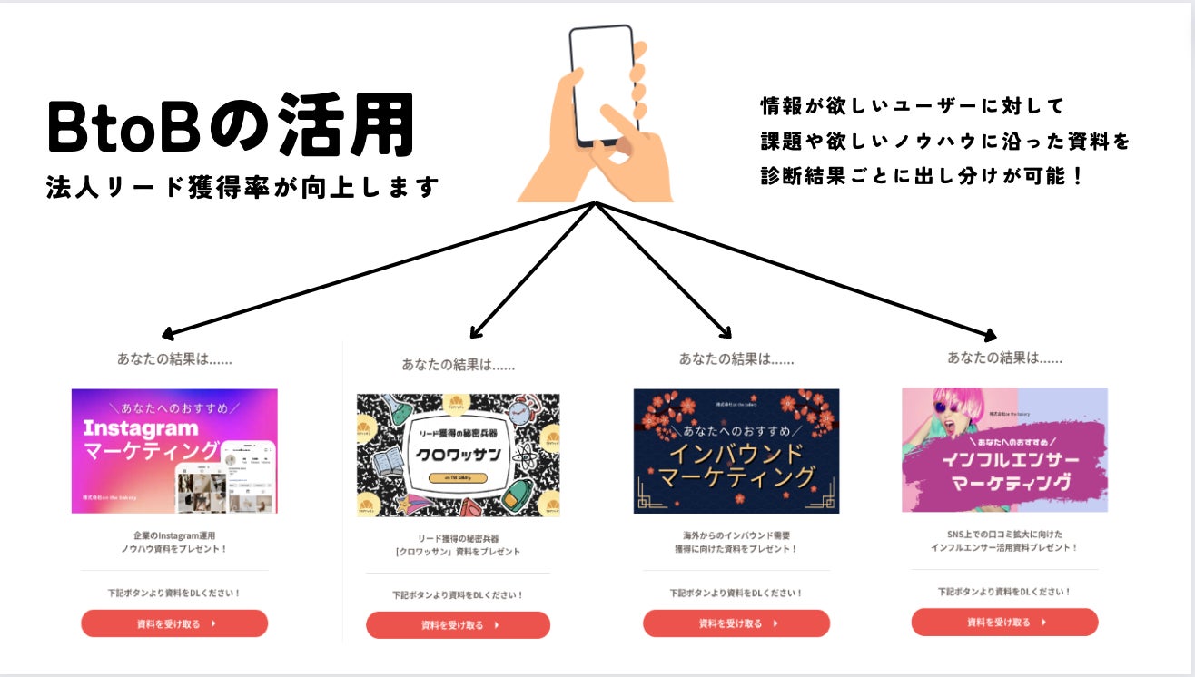 BtoBリード獲得機能である診断結果ごとにホワイトペーパーを出し分けてユーザーへ表示する使い方も活用していきたいと思っています。