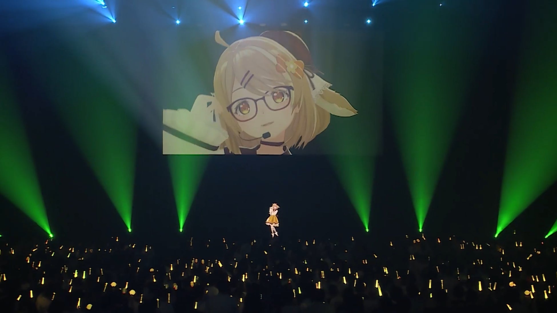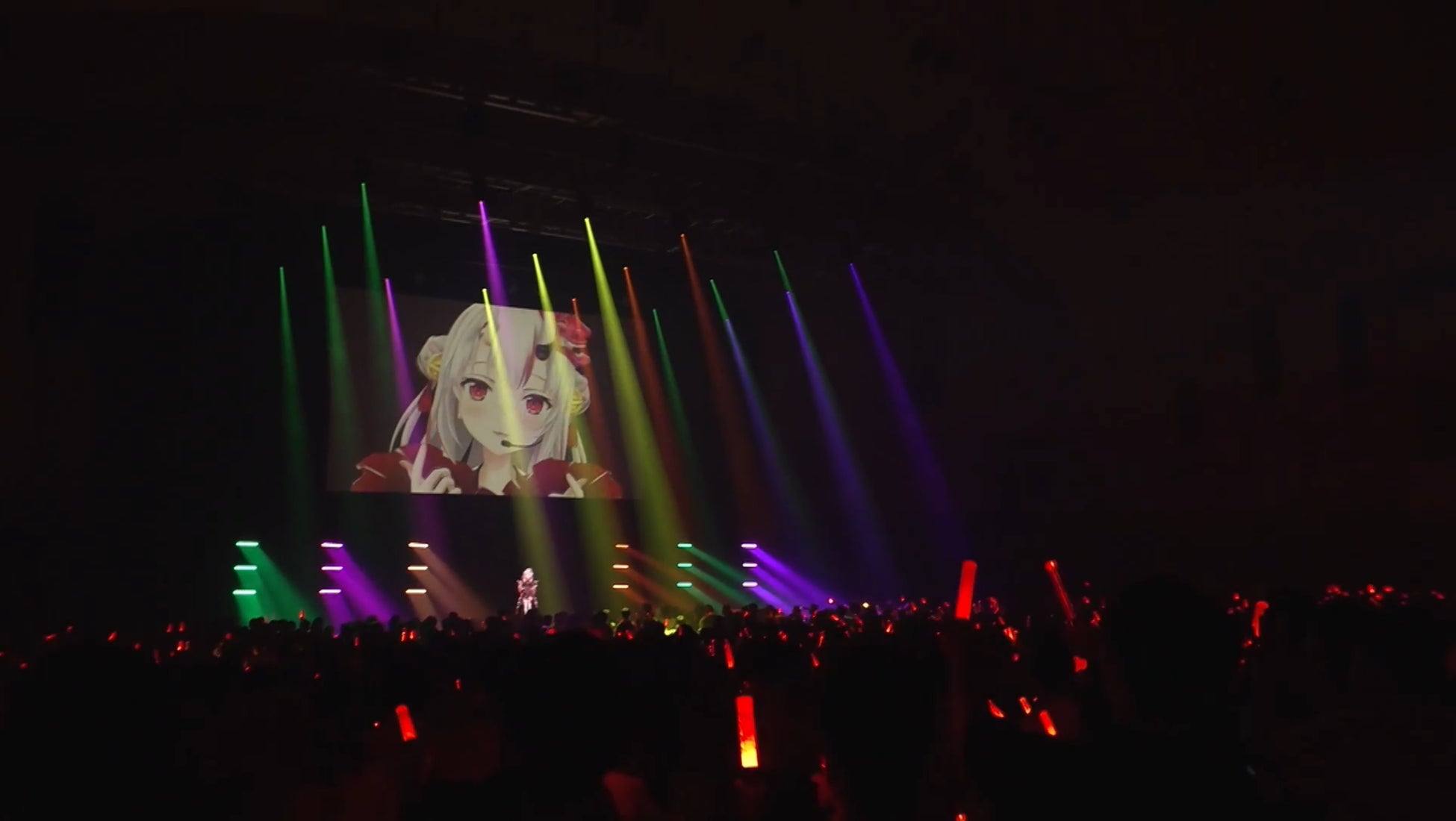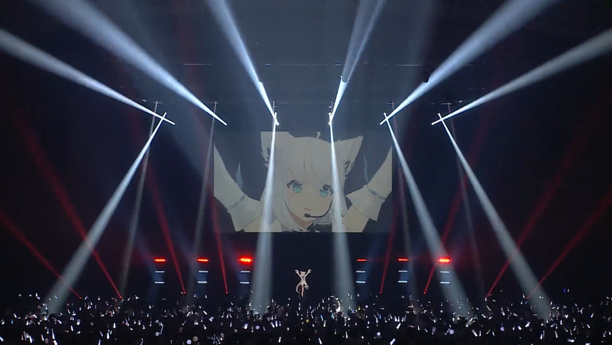 白上フブキは「LETTER☆彡」を披露。冒頭の一言が響き渡った瞬間、会場は一斉に湧き上がった。ストレートでメッセージ性のある歌詞は、ファンへの感謝と愛情が込められ、彼女の歌声は、ファン一人一人の心に訴えかけるように会場を包み込み、彼女のパフォーマンスはファンとの絆を深める時間となっていた。そして最後に「すこん部100万回愛しているよー!」とファンに想いを届け、呼応するように白いペンライトが星空のように輝き、会場全体を照らした。