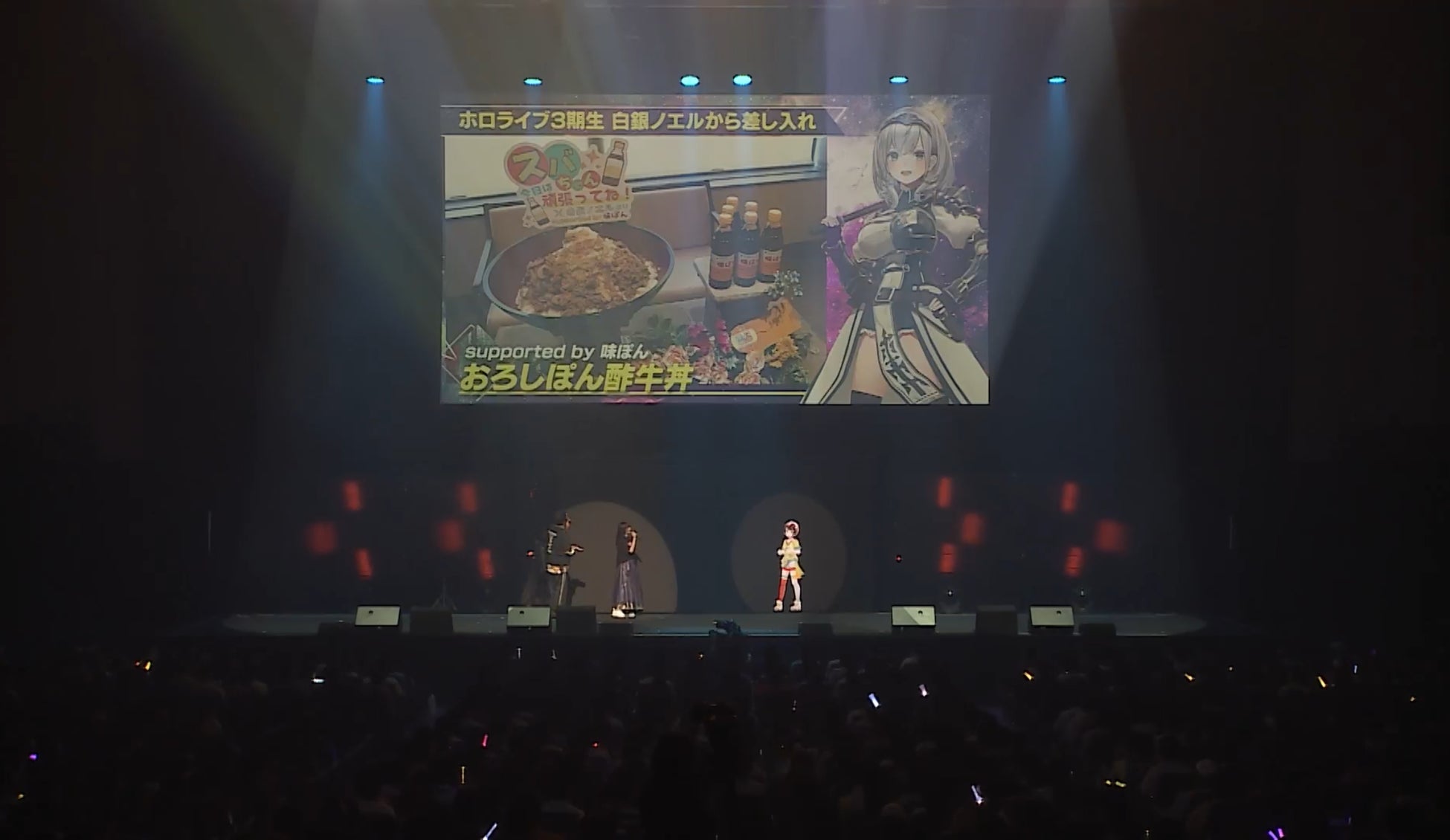 MCタイムでは大空スバル宛に届いた、ホロライブの後輩、白銀ノエルからのメッセージが話題に。「スバちゃん!!『MUSIC VERSE Fes.』開催おめでとうございます!」「ささやかながら団長の大好きな『おろしポン酢牛丼』を差し入れさせていただきます!」と愛のこもったメッセージがあり、「ホロライブ×ミツカンさんで『味ぽん』をPRする『ホロぽん飯テロ部』というキャンペーンが始まります!」との内容に、「味ぽんさんの案件じゃないかー!」とスバルは突っ込みながらも、後輩からの心温まる差し入れとメッセージにファンも笑顔が絶えず、会場がほっこりムードに。このイベントでしか見られない「ノエスバ(ノエル×スバル)」の絡みに、MCタイムは盛り上がりを見せた。