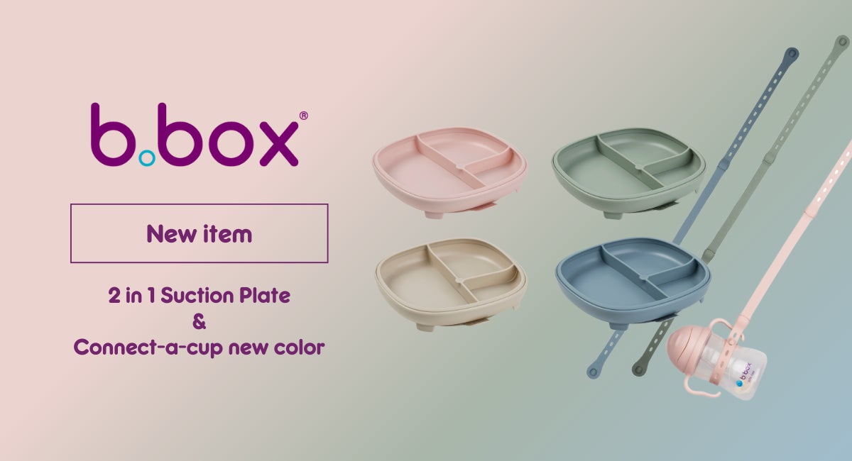 【b.box】新登場!b.boxから、楽しく便利なお食事アイテム「2 in 1 サクションプレート」と「コネクト ア カップ」のくすみカラーが初お目見え!