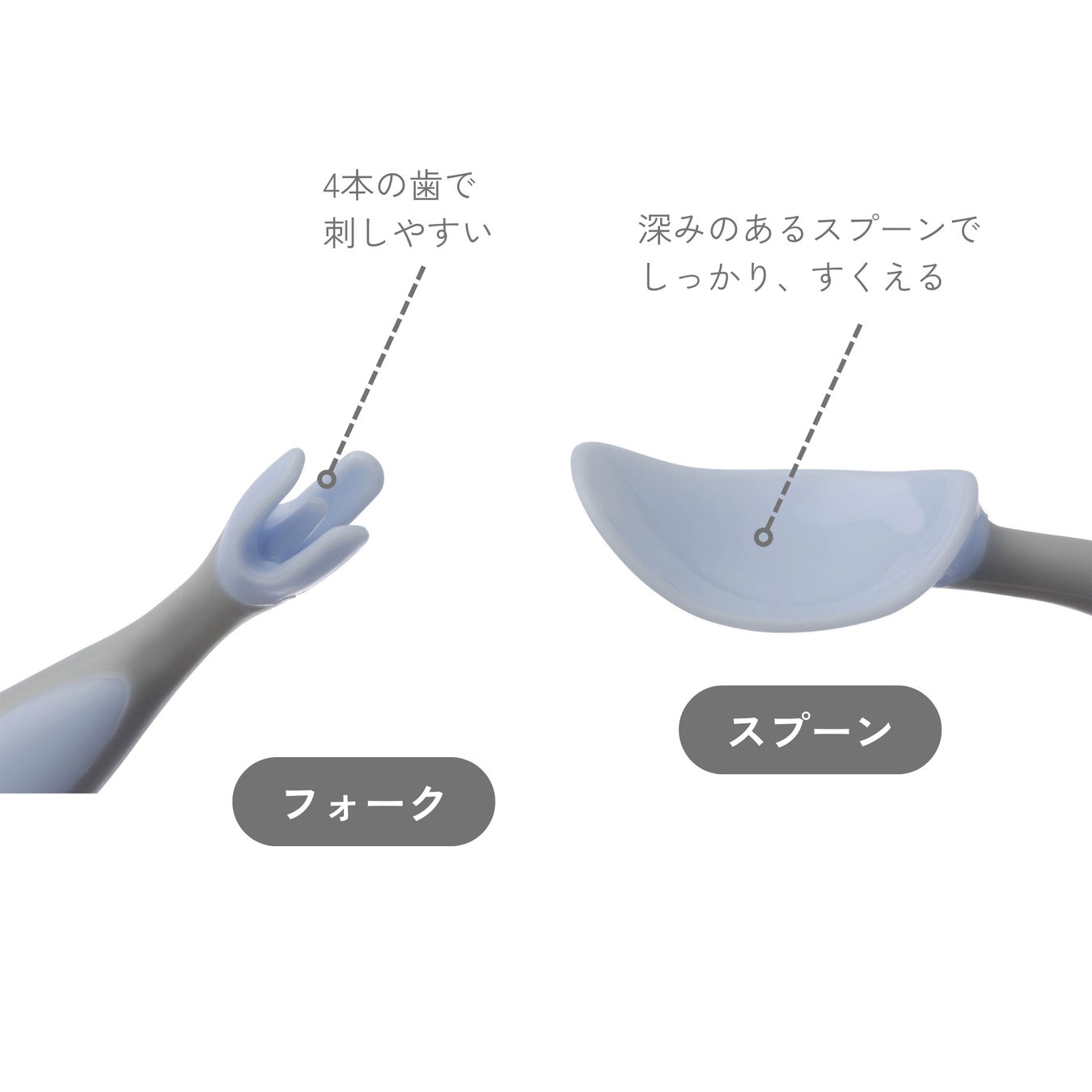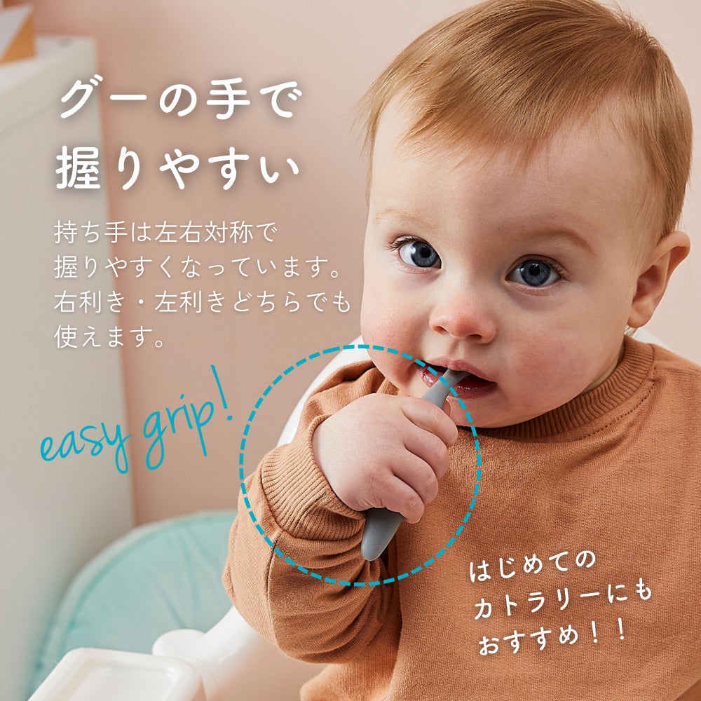 離乳食スプーンとしてお使いいただけるだけでなく、生後9ヶ月頃からファーストスプーンとして、自分で食べる練習としてもおすすめしたい、赤ちゃん用スプーン&フォークのセットです。※右利き・左利き関係なくお使いいただけます。 小児作業療法士監修で、子供の口のサイズに合わせて、握りやすく、すくいやすく、刺しやすいデザインになっています。 食洗機対応なのでお手入れも簡単。ケースに入れて、子連れランチなどのお出かけにも活躍してくれるアイテムです。