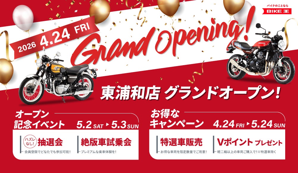 「常識を壊し、新たな価値と感動を生む」を企業理念に掲げ、「バイクライフの生涯パートナー」を目指す株式会社バイク王&カンパニー(代表取締役CEO:澤 篤史、本社:東京都世田谷区、証券コード:3377、以下「当社」)は、埼玉県さいたま市に「バイク王 東浦和店」、(以下「当店舗」)を4月24日(金)に新規オープンします。