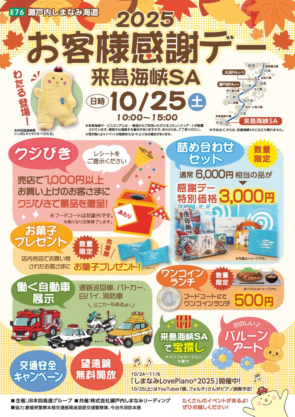キャンペーンの一環として、このたび、日頃の感謝を込めて、E76西瀬戸自動車道(瀬戸内しまなみ海道)来島海峡SAにおきまして、「お客様感謝デー」を以下のとおり開催いたします。