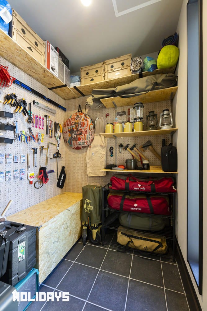 土間スペースは見せる収納で趣味のキャンプ用品や工具をおしゃれに収納。ちょっとした作業スペースとしても使用できます。