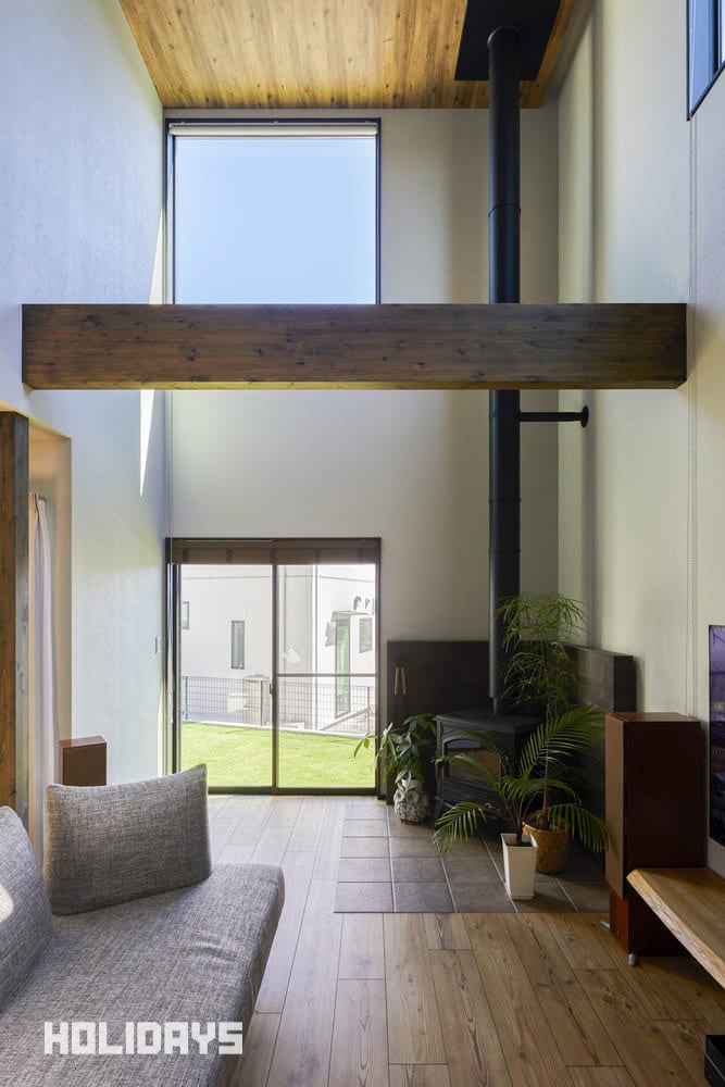 吹き抜けには大開口窓と2面に高窓を設置。空の色合いや雲の移ろいを感じられる特別な空間です。化粧梁は深い色を採用することで、空間にメリハリと落ち着きをプラスしています。
