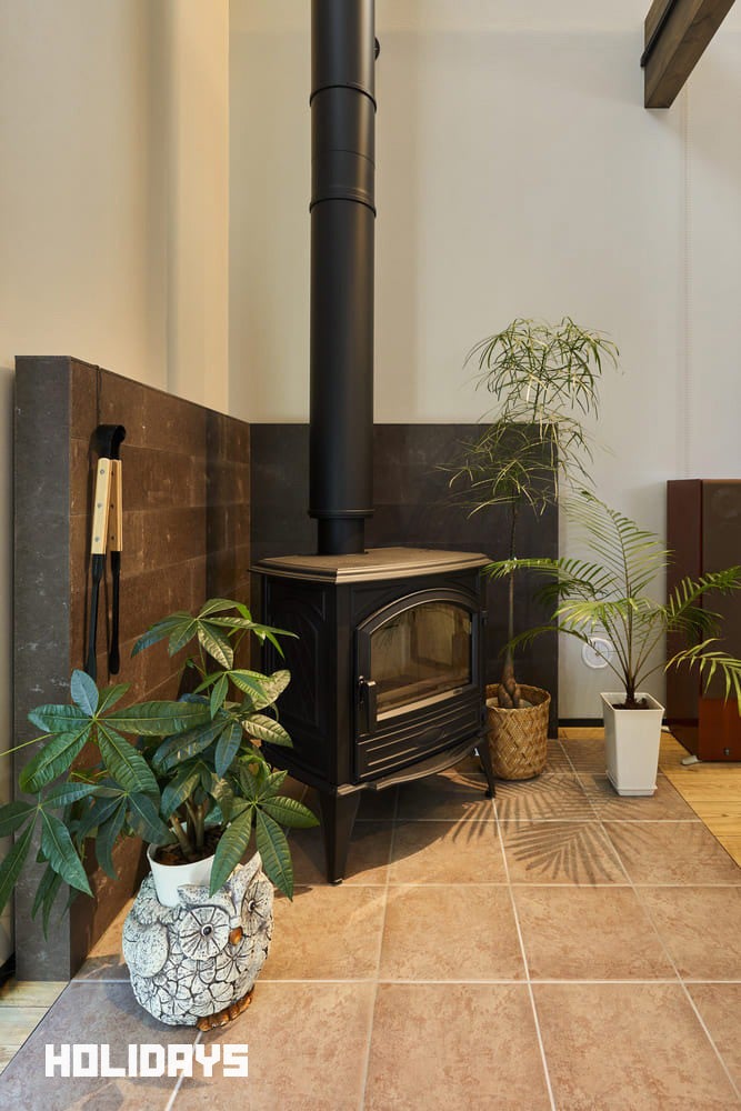 LDKの顔にもなる薪ストーブはデザイン性の高いものを採用。インテリアとしても存在感のある印象に。