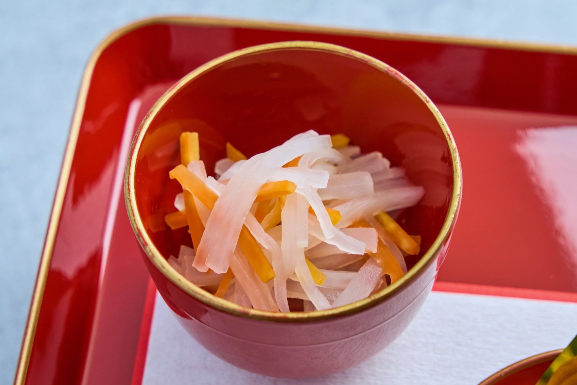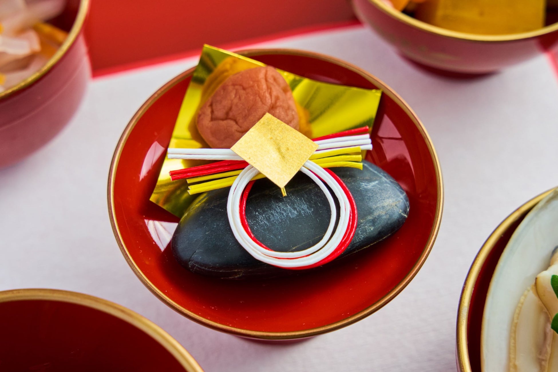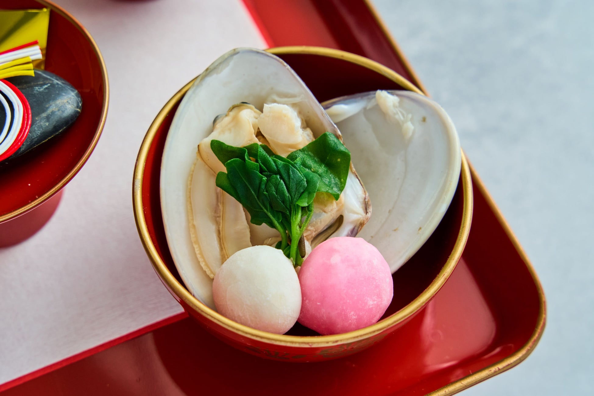 煮物には、亀甲南瓜、有頭海老、手毬麩、蕗、松笠くわい、竹の子、梅人参を。様々な食材を一つのお鍋で"炊く"ことから「多喜(たき)合わせ」とも呼ばれ、家族が仲良く末永く繁栄するようにという意味が込められています。お吸い物には、吸う力が強くなるようにと願いを込めてはまぐりを使い、長持ちを意味する紅白のお餅を添えました。貝には、良い伴侶に巡り合えるという意味も込められています。