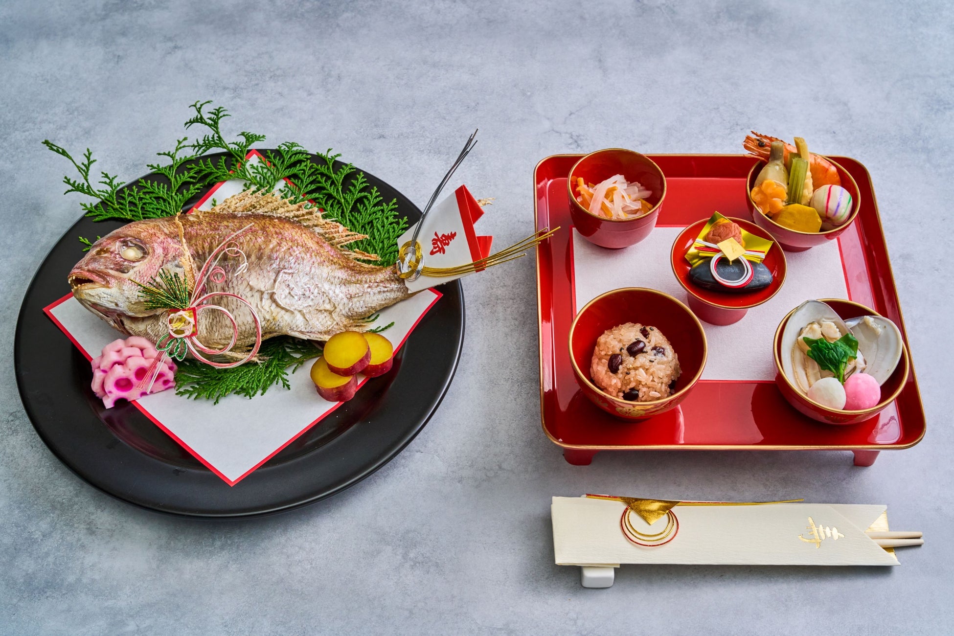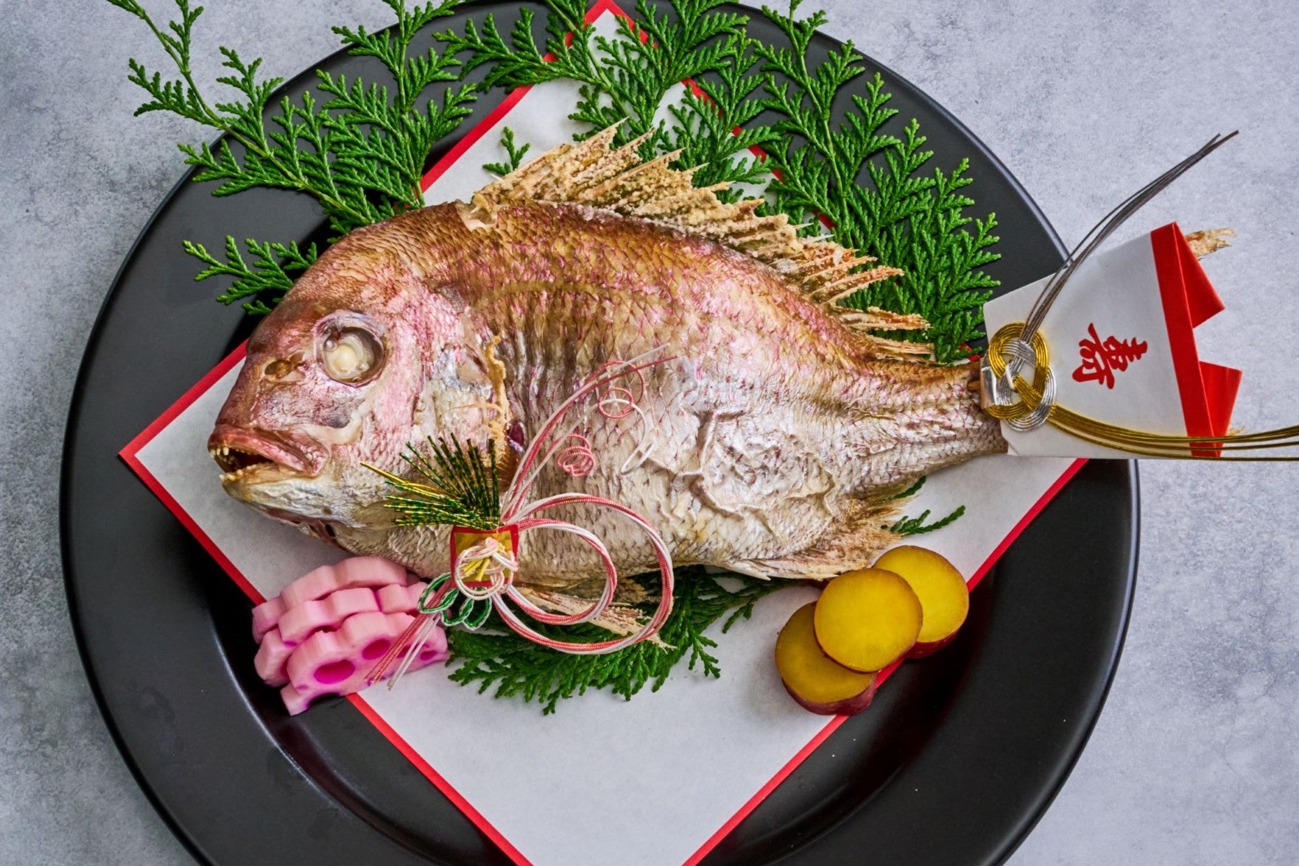 鯛は、魔除けによいとされる「赤」い衣と「白」い身を持ち紅白の色合わせであることや、「めでたい(鯛)」という語呂合わせから、祝膳に欠かせない魚です。
