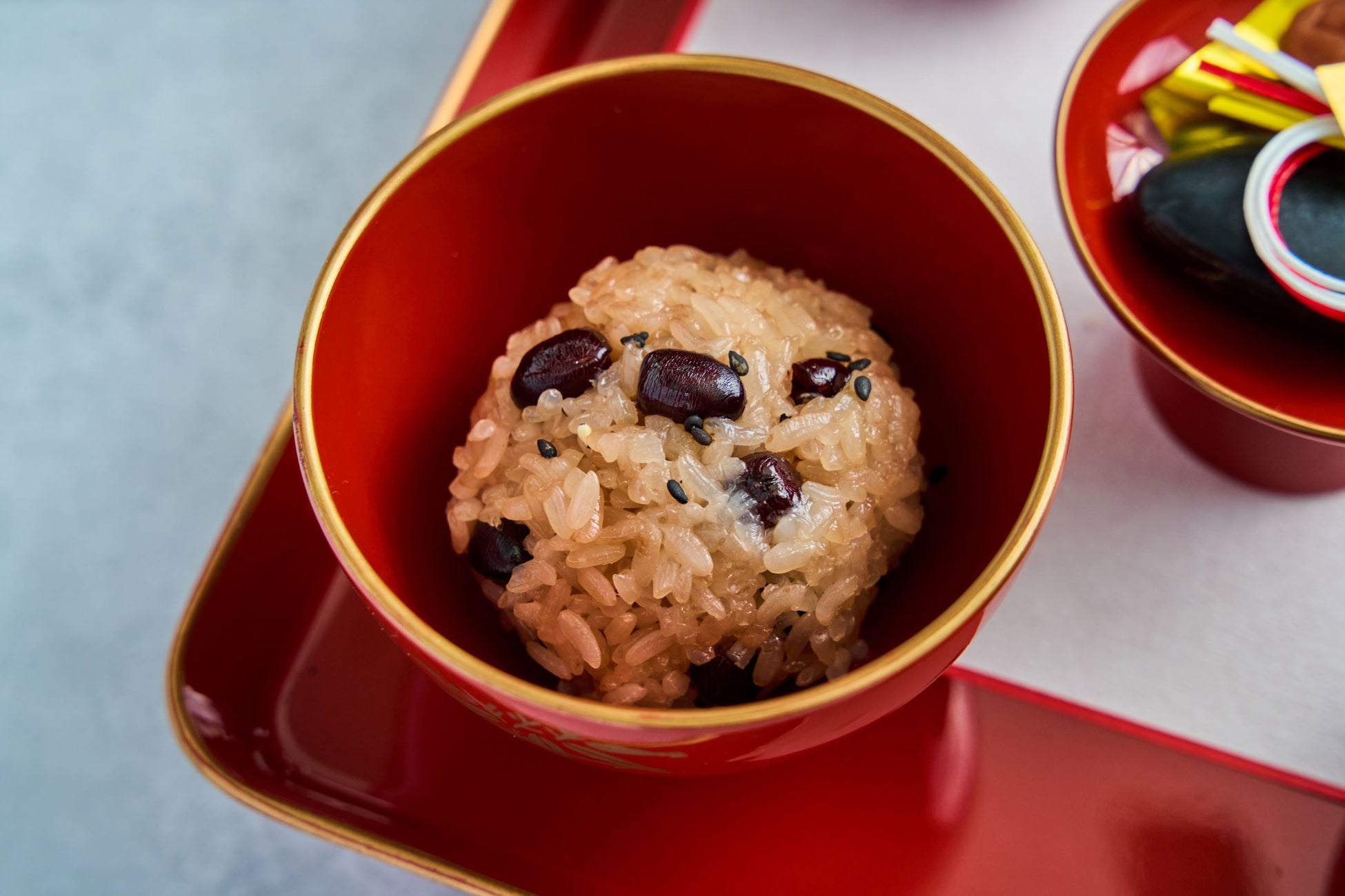 香の物には、お祝いの水引に似ていることから縁起が良い「紅白なます」を。飯椀には赤飯をご用意。赤飯の「赤」は古くから魔除けの意味があり、お子様の健やかな成長を守る色とされています。高杯には丈夫な歯になるようにと歯固め石を、梅は寒い冬を越えて実をつけることから、辛抱強くなるように、しわしわになるまで長生きするようにと梅干しを添えました。