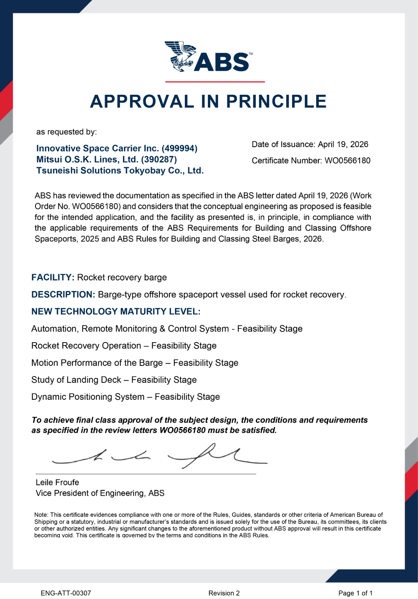 本承認は、ロケットの洋上回収船に加え、回収を支援する支援船やそれらを統合的に監視・制御する陸上管制システムを含む、洋上回収システム全体のコンセプトについて、安全性・技術的成立性が第三者機関であるABSにより確認されたものです。