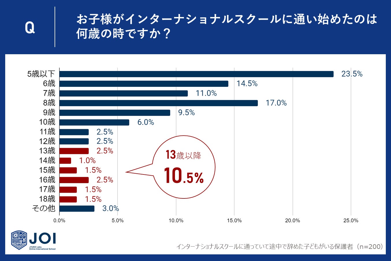 保護者が子どもをインターナショナルスクールに通わせる時期として最も多いのは5歳以下(23.5%)であり、8歳までに通わせる家庭が66.0%に達します。しかし、中学生以降に通学させる家庭はわずか10.5%にとどまり、小学生のうちに退学するケースが84.5%と大半を占めていることが判明しました。