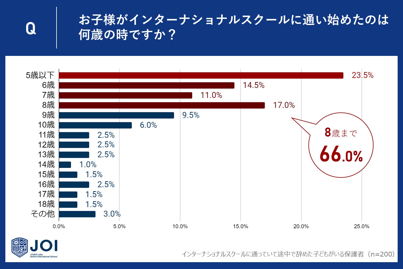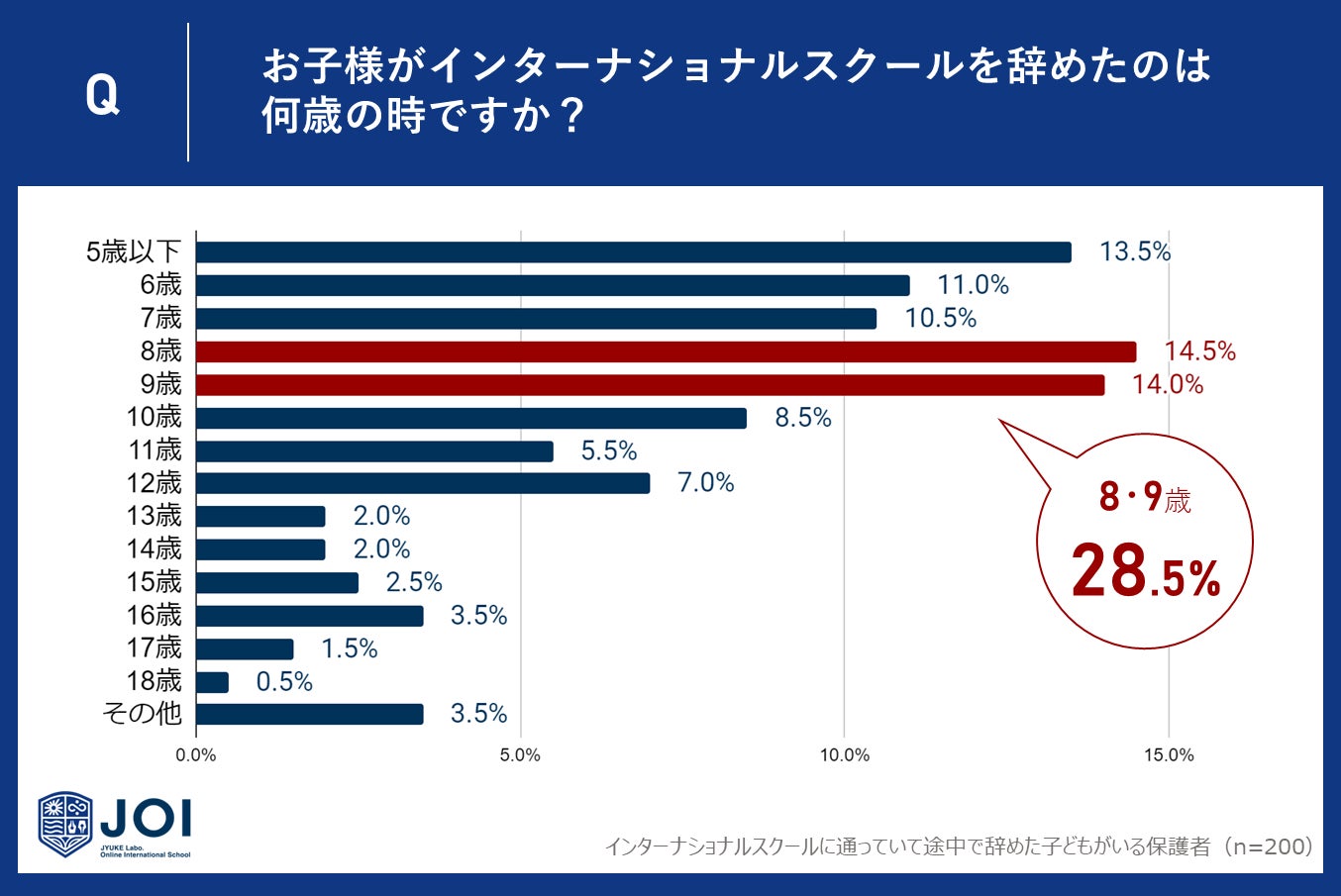 インターナショナルスクールを途中で辞めた子どもたちの当時の年齢の調査結果によると、8歳で辞めた子どもの割合は14.5%で最も高く、次いで9歳が14.0%と合計で28.5%が小学校の2年生・3年生の時期に退学している事がわかりました。