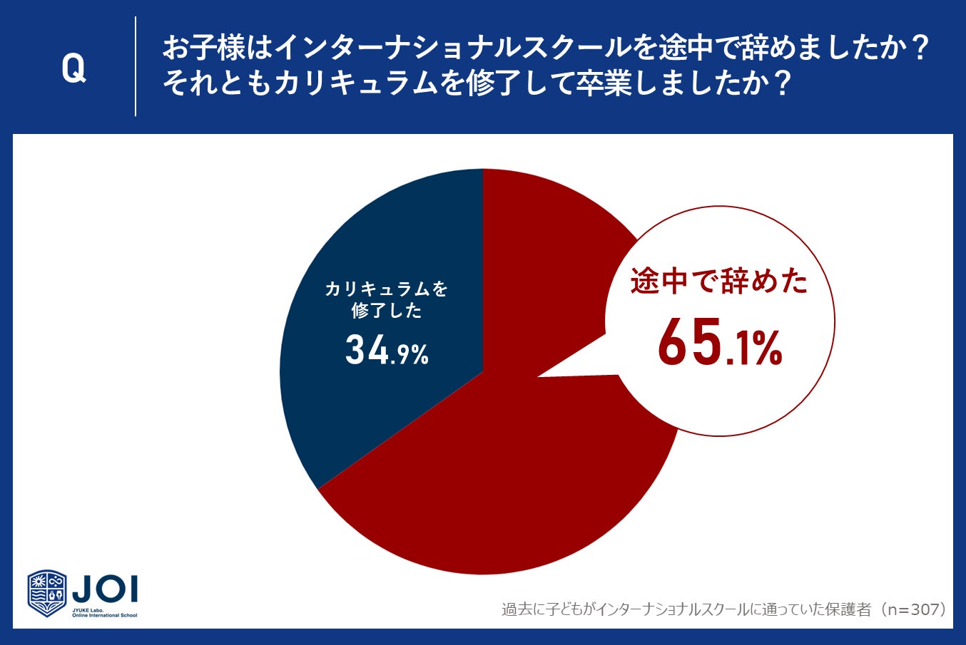 子どもが過去にインターナショナルスクール通っていた保護者を対象に実施したアンケート調査の結果、驚くべきことに65.1%もの子どもが途中で退学していることが明らかになりました。