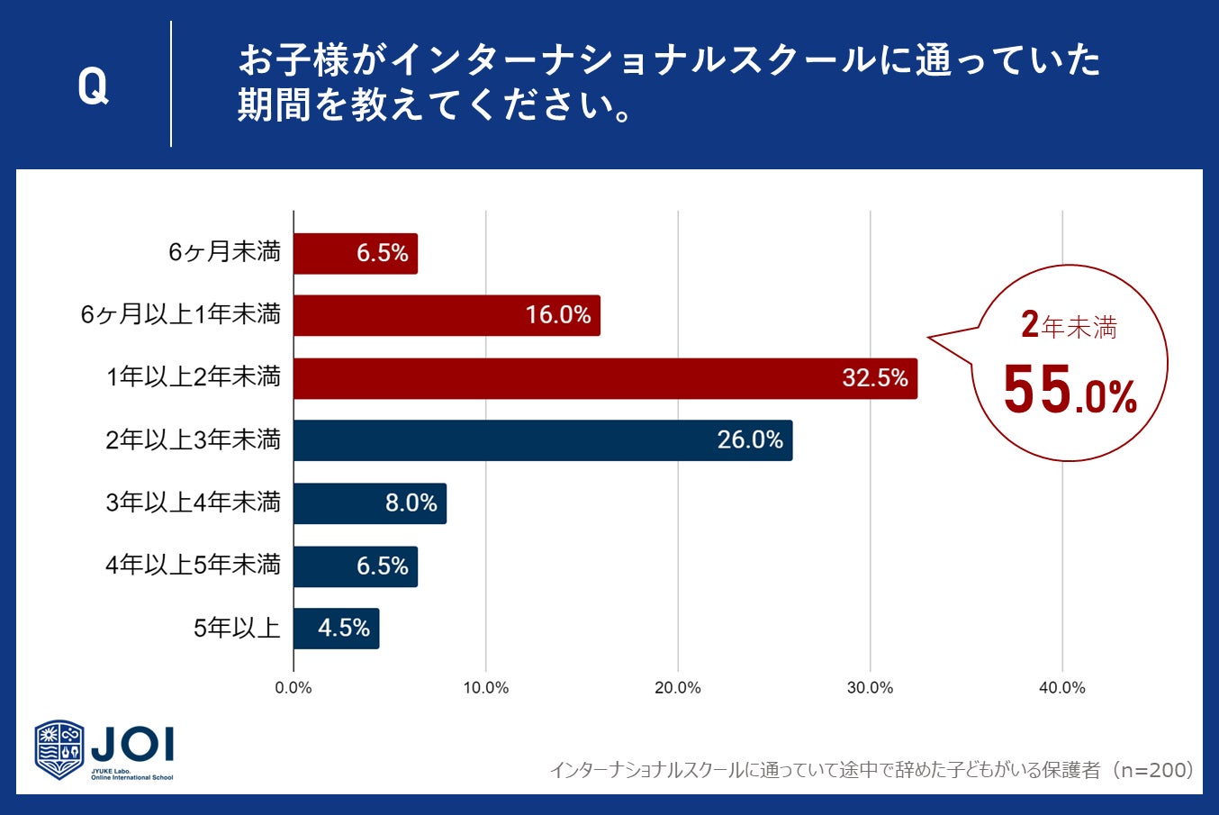 インターナショナルスクールを途中退学した生徒の保護者を対象に行った最新のアンケート調査によると、最も多くの子どもたち(32.5%)が1年以上2年未満の期間をインターナショナルスクールで過ごした後に辞めていることが明らかになりました。2年未満を合計すると55%と過半数を超える子ども達が、インターナショナルスクールの教育を一定期間試みるものの、2年以上継続する前に別の選択をしていることが推測されます。