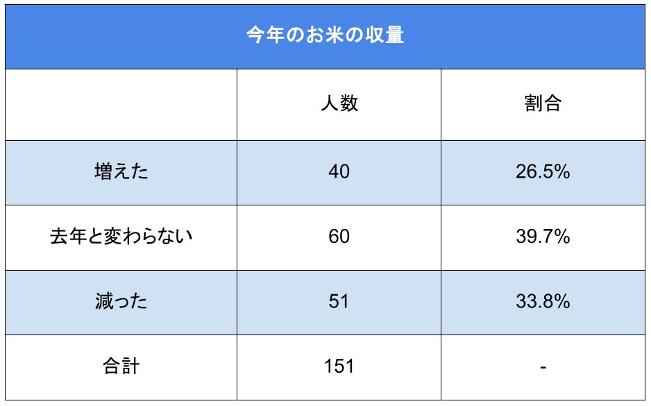 「今年のお米の収量はいかがでしたか?」(n=151)と生産者様に質問したところ、「増えた」と回答した方が40名(26.5%)、「去年と変わらない」と回答した方が60名(39.7%)、「減った」と回答した方が51名(33.8%)という結果となりました。