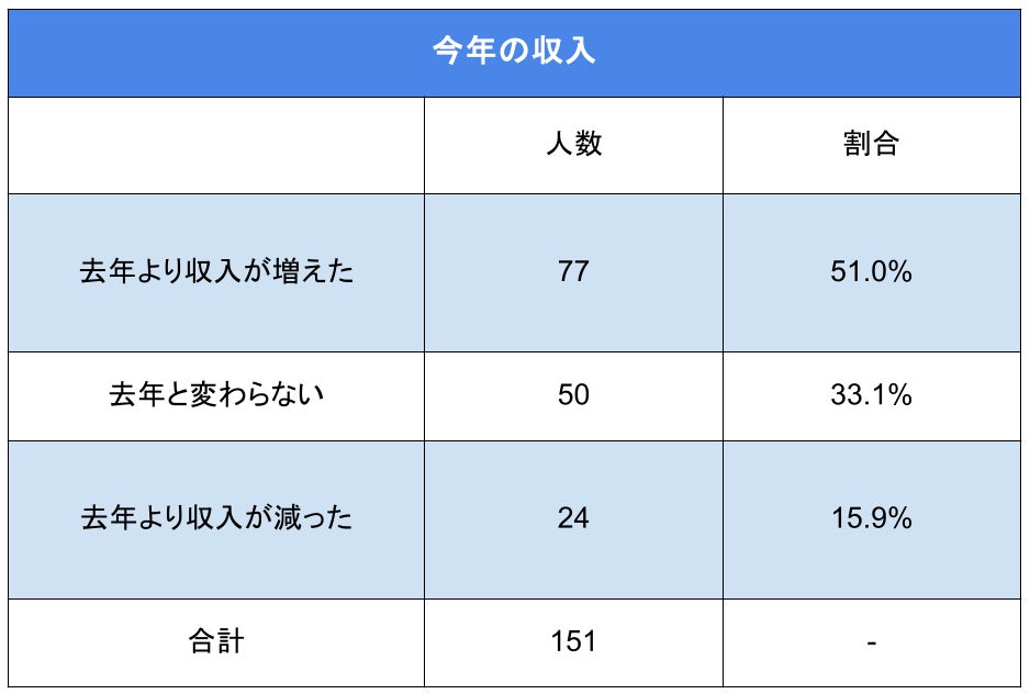 「今年の収入はいかがでしたか?」(n=151)と生産者様に質問したところ、「去年より収入が増えた」と回答した方が77名(51.0%)、「去年と変わらない」と回答した方が50名(33.1%)、「去年より収入が減った」と回答した方が24名(15.9%)という結果となりました。