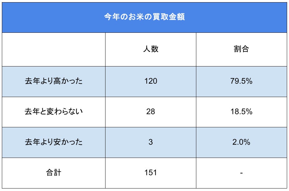 「今年のお米の買取金額はいかがでしたか?」(n=151)と生産者様に質問したところ、「去年より高かった」と回答した方が120名(79.5%)、「去年と変わらない」と回答した方が28名(18.5%)、「去年より安かった」と回答した方が3名(2.0%)という結果となりました。約8割の生産者様がお米の買取金額が上がったという実感をされているということがわかりました。