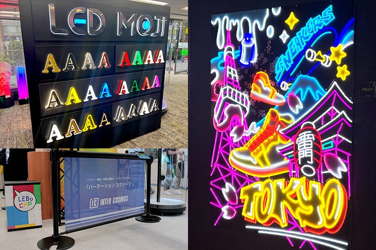 おしゃれな演出ができる「LEDレインボーネオン」や立体感あるチャンネル文字をはじめ、パーテーションポールに取り付けて案内表示ができる「パーテーションスクリーン」、メディアの差し替えが簡単な壁面ディスプレイ「ファブリックチェンジャー」など、空間づくりの幅を広げるアイテムが揃います。
