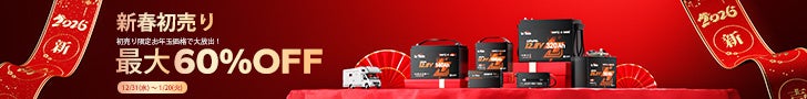 12/31(水)〜1/20(火)の期間中は、LiFePO4バッテリーを中心に、充電・変換・制御に必要な周辺機器まで幅広くラインアップし、初売り限定の最大60%OFFという年玉価格でご提供します。