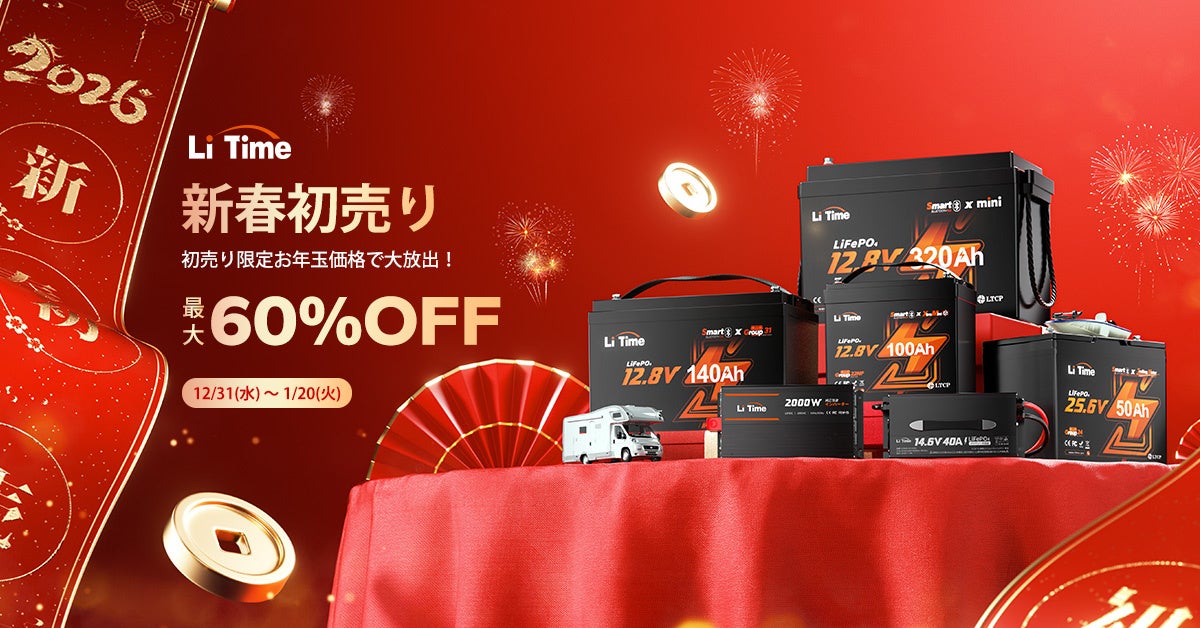 LiTime「新春初売りセール」開催中!初売り限定の最大60%OFFで人気のLiFePO4バッテリー&周辺機器を大放出
