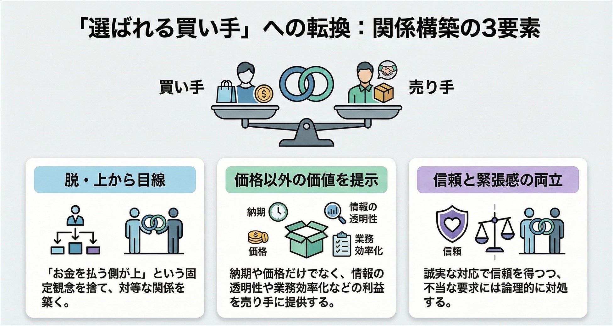 企業には、単なるコスト削減の追求だけでなく、売り手にとっても利益や価値のある提案を行う姿勢が求められています。取引プロセスを最適化し、長期的な信頼関係を構築できる調達担当者の育成が、事業継続における重要な課題です。