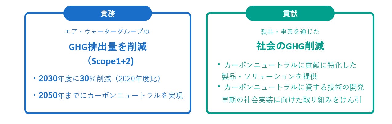 エア・ウォーターグループは、カーボンニュートラルをはじめとした地球環境問題への対応を「企業の社会的責任」と してだけではなく「成長の機会」につなげるため、自社の温室効果ガス(GHG)排出量を減らす「責務」と、製品・事 業を通じた社会のGHG 排出削減への「貢献」の両面から、社会のカーボンニュートラル化に取り組んでいます。