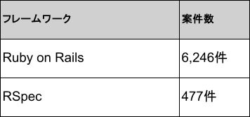 2026年4月時点のRubyフレームワーク別案件数では、1位がRuby on Railsで6,246件、2位がRSpecで477件です。