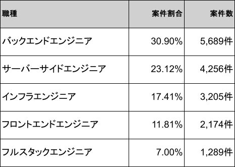 2026年4月時点のRuby案件の職種は、バックエンドエンジニア30.90%(5,689件)が最多、次いでサーバーサイドエンジニア23.12%(4,256件)、インフラエンジニア17.41%(3,205件)、フロントエンドエンジニア11.81%(2,174件)、フルスタックエンジニア7.00%(1,289件)です。
