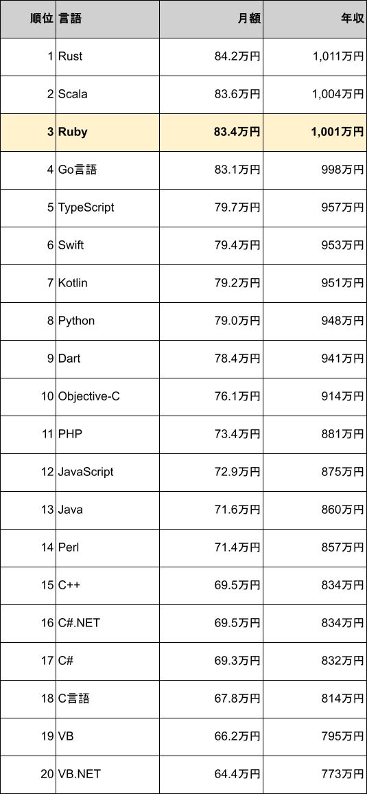 Ruby案件の平均月額単価は83.4万円、平均年収は1,001万円で、プログラミング言語別の年収ランキングでは3位に位置しています。