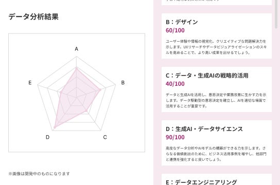 生成AIリテラシーから実務に直結する高度なスキルまで、各種スキルレベルを細分化し評価。AIを活用したデータ分析やツール活用力、問題設定力、倫理観など、実務に活かせる観点を多面的にアセスメントします。