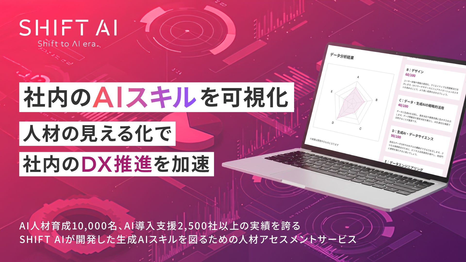 「日本をAI先進国に」を掲げAIのビジネス活用を学べるAI大学「SHIFT AI」を運営する株式会社SHIFT AI(本社:東京都渋谷区、代表取締役 木内翔大、以下 当社)は、2025年3月より法人向けに「生成AIスキルアセスメントサービス」( https://lp-biz-assessment.shift-ai.co.jp/ )を新たに提供開始いたします。