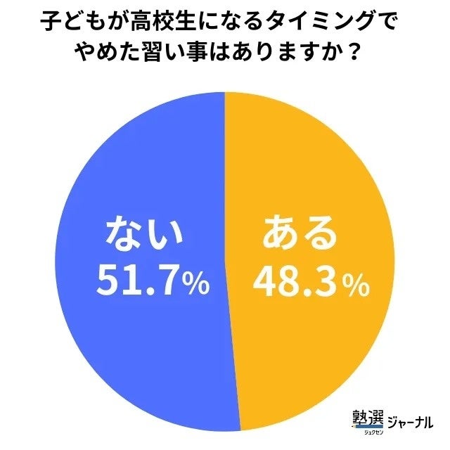 高校進学時の習い事の変化を聞いてみると、48%が習い事をやめていました。高校に入学すると、通学時間の増加や中学校と高校で学校の特色が違うなど、生活環境が大きく変わるため、中学入学時と同じように習い事を見直しているようです。