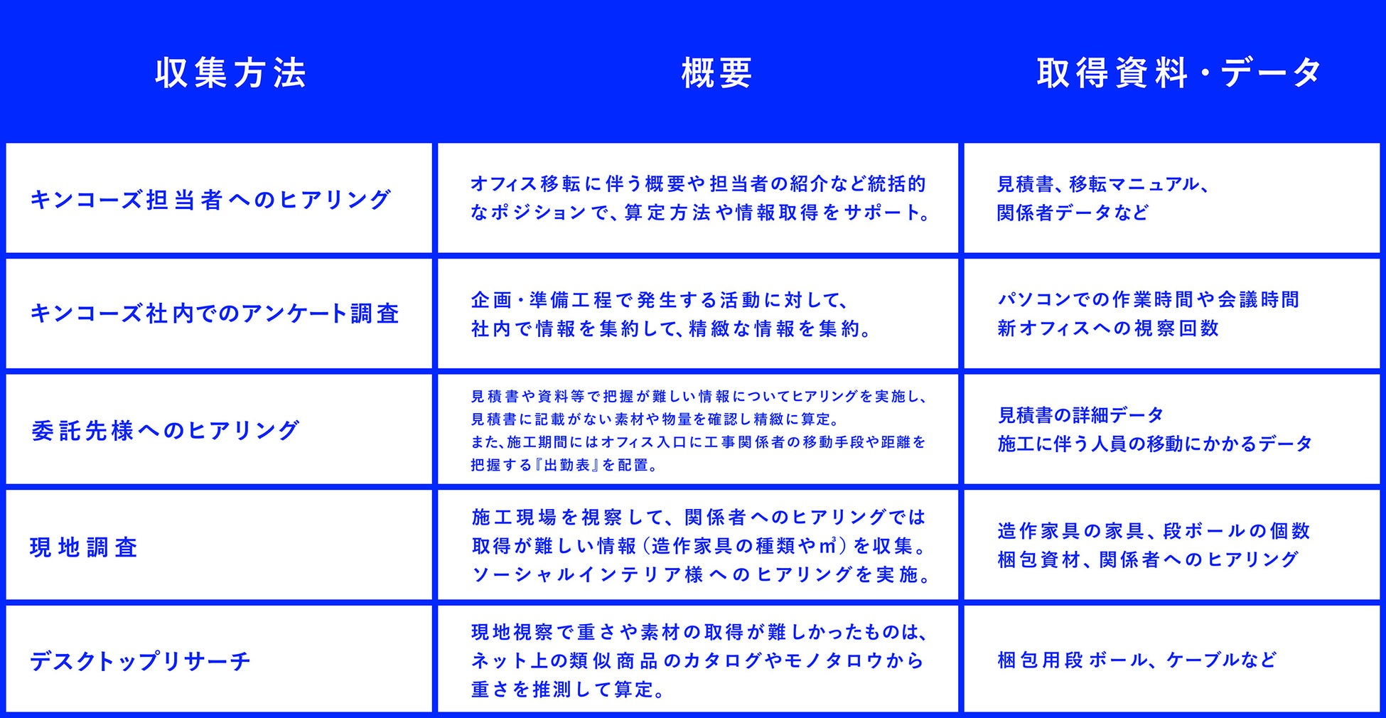 例えば移転準備に伴うパソコン作業や会議時間も感覚的な推測ではなく、実際の活動量を記録し、より現実に近い排出量を算出しました。また、施工会社への直接ヒアリングと見積書を参考に、金額ベースでなく「物量ベース」での算定を実施。輸送管理シートや出勤表を活用し、電話での聞き取りを重ねることで、実査に近い信頼性の高いデータ収集を行いました。