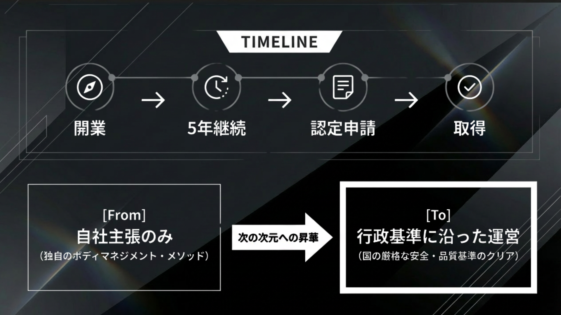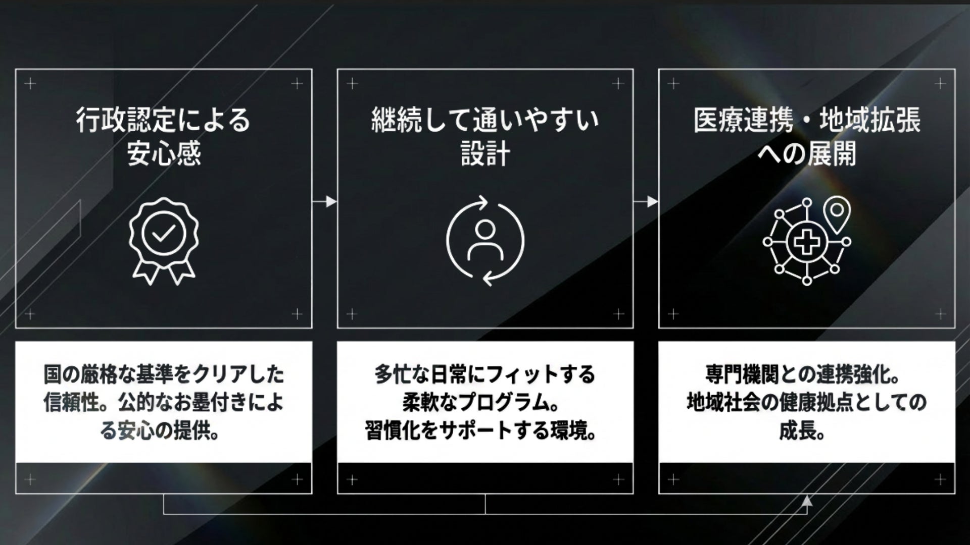 営業開始から5年が経過し、長期継続で通われる会員様も多い中で、当社は「一方的に良い施設だと主張する」のではなく、行政の認定を受けた運営体制を整えることが、最もクライアントファーストであり、長く安心して通える施設づくりにつながると考え、今回の申請・認定取得に至りました。