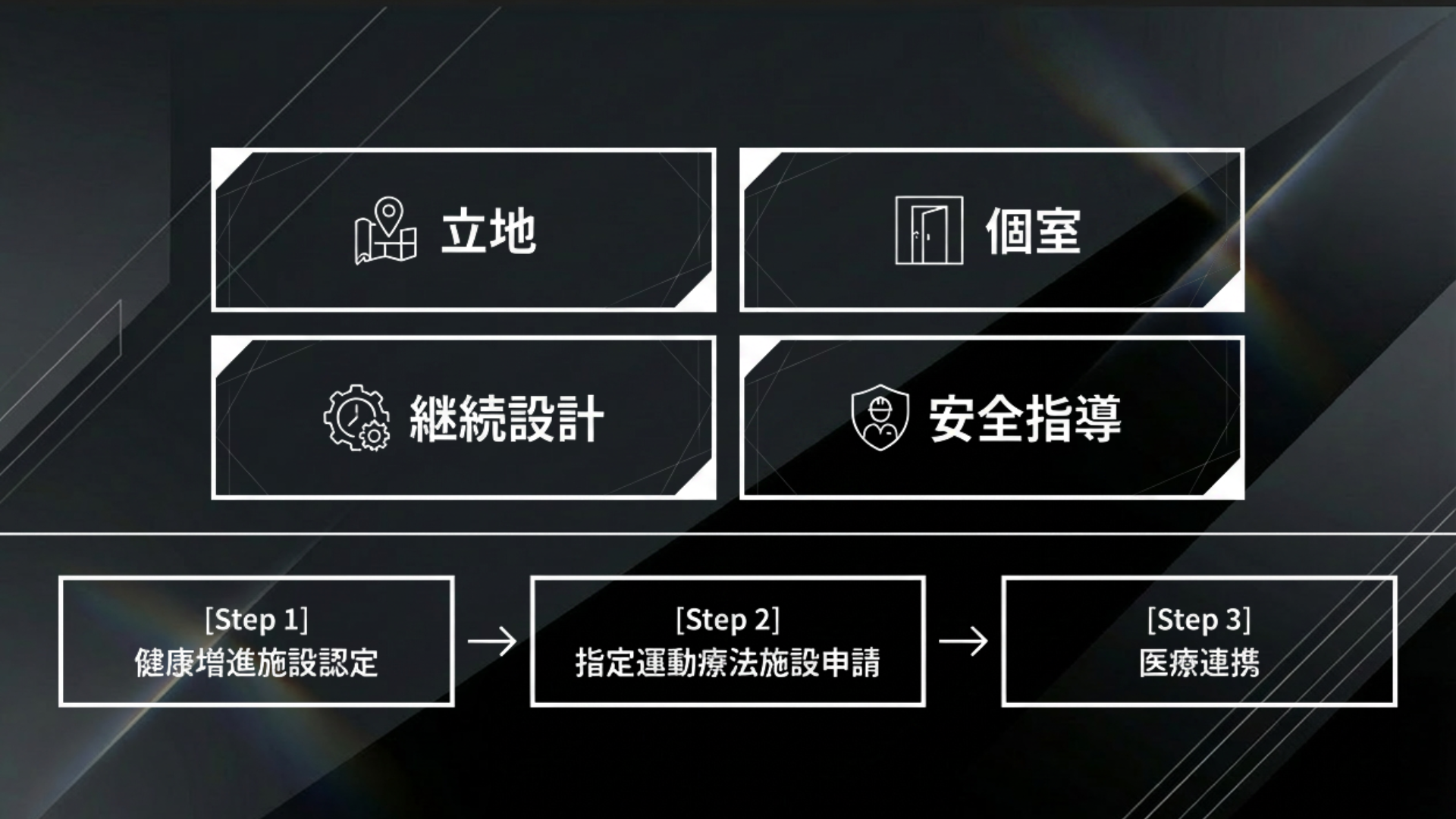 当社施設は医療機関ではありません。診断・治療を行うものではありません。運動療法に関する連携や提供範囲は、今後の申請認定・連携体制の整備状況に基づき、適切に設計します。
