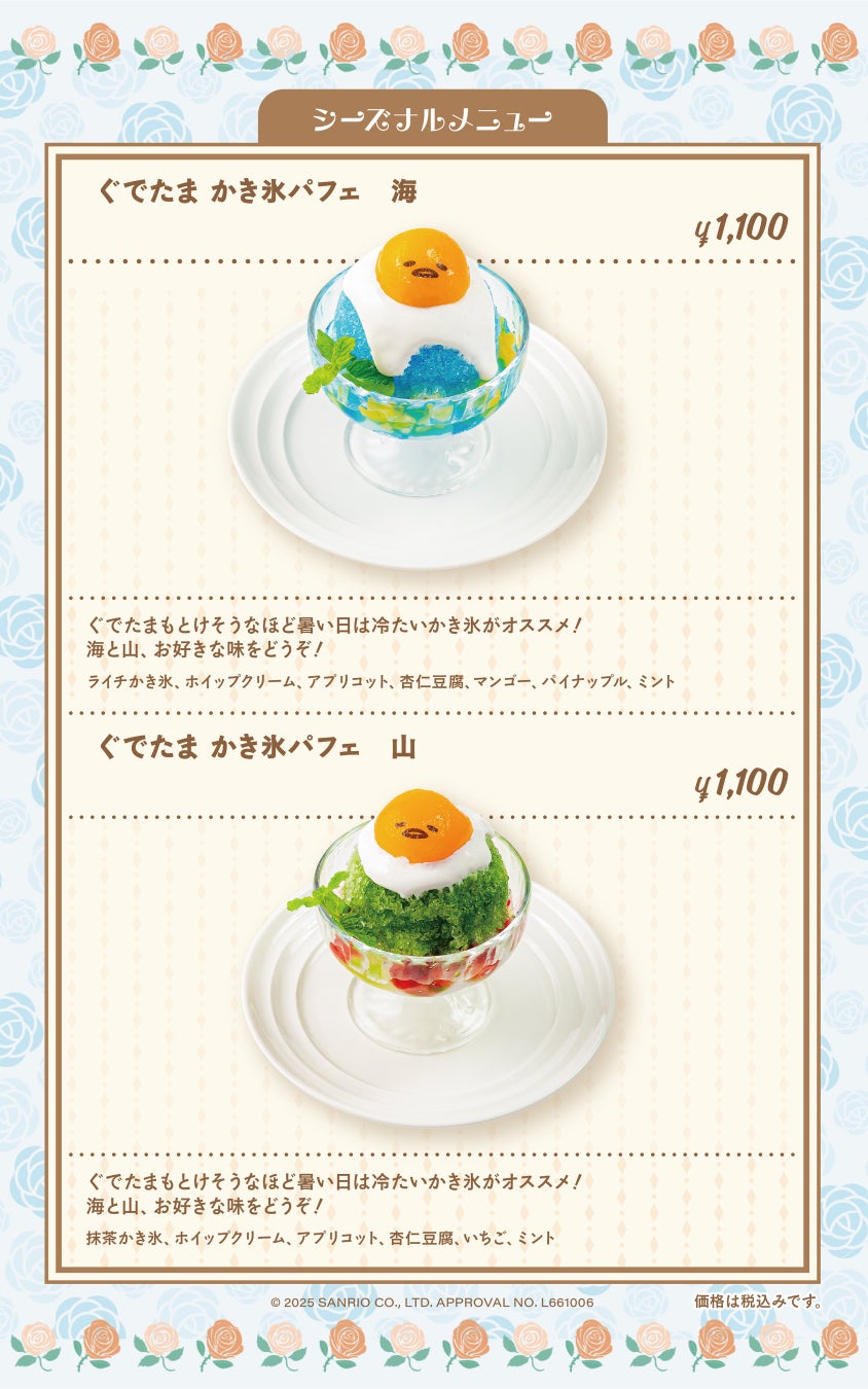 「ぐでたま かき氷パフェ」はライチかき氷の”海”と抹茶かき氷の”山”の二種類を展開。アプリコットとホイップクリームで仕上げたぐでたまは、まるで本物の卵!?