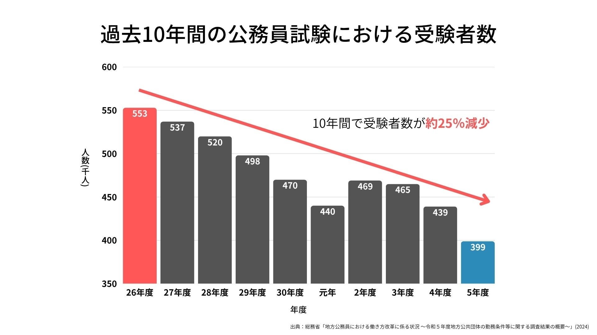 少子高齢化や価値観の多様化を背景に、自治体の人材確保はこれまでにない困難な状況に直面しています。総務省の調査によると、過去10年で地方公務員試験の受験者数は約25%減少しています。さらに、若手職員の離職や民間企業への転職も増加しており、人材確保と定着が大きな課題となっています。