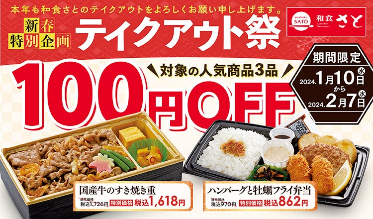 国内197店舗を展開する「和食さと」では、新春特別企画として人気の商品を100円(税込108円)引きでお得に販売する「テイクアウト祭」を期間限定で開催します♪