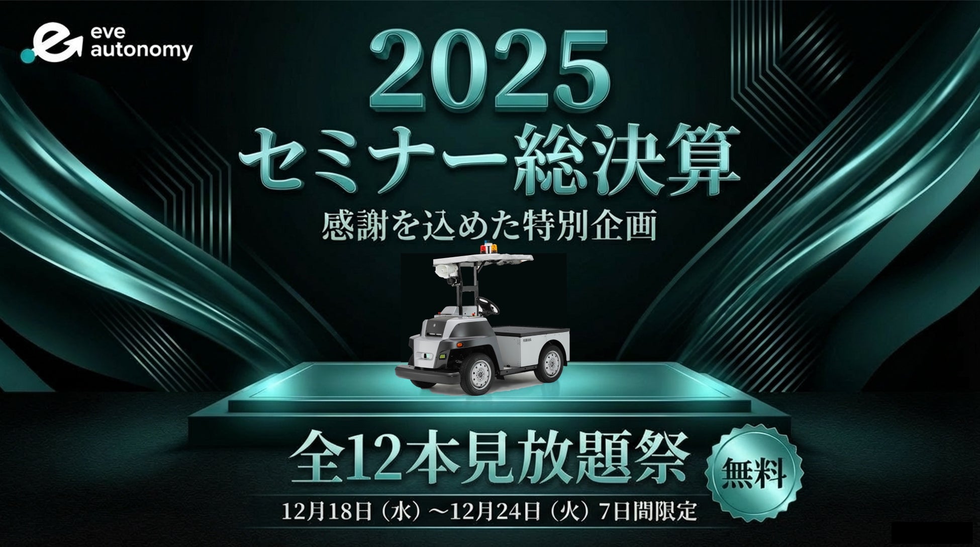 株式会社eve autonomy(イブ・オートノミー、静岡県磐田市、代表取締役CEO:星野 亮介、以下「eve autonomy」)は、2025年への感謝を込め、今年配信したセミナーを中心に、これまで公開してきたオンラインセミナーを2025年12月18日(木)〜12月24日(水)の7日間限定で見放題とする特別企画を実施します。
