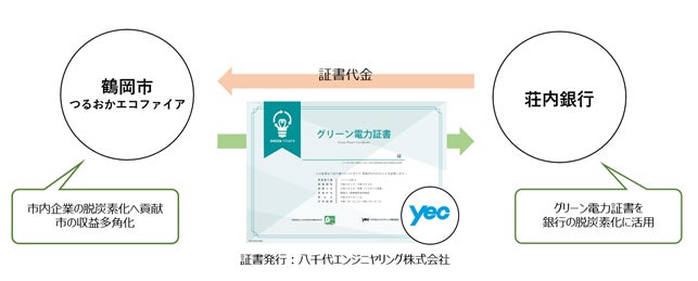 本事業は、つるおかエコファイアが再生可能エネルギー(バイオマス)により発電したグリーン電力に含まれる環境価値を、八千代エンジニヤリングがグリーン電力証書として発行し、荘内銀行が調達するものです。荘内銀行が支払った費用は鶴岡市に渡り、地域の課題解決のために使われ、環境価値の地産地消と地域経済循環につながります。