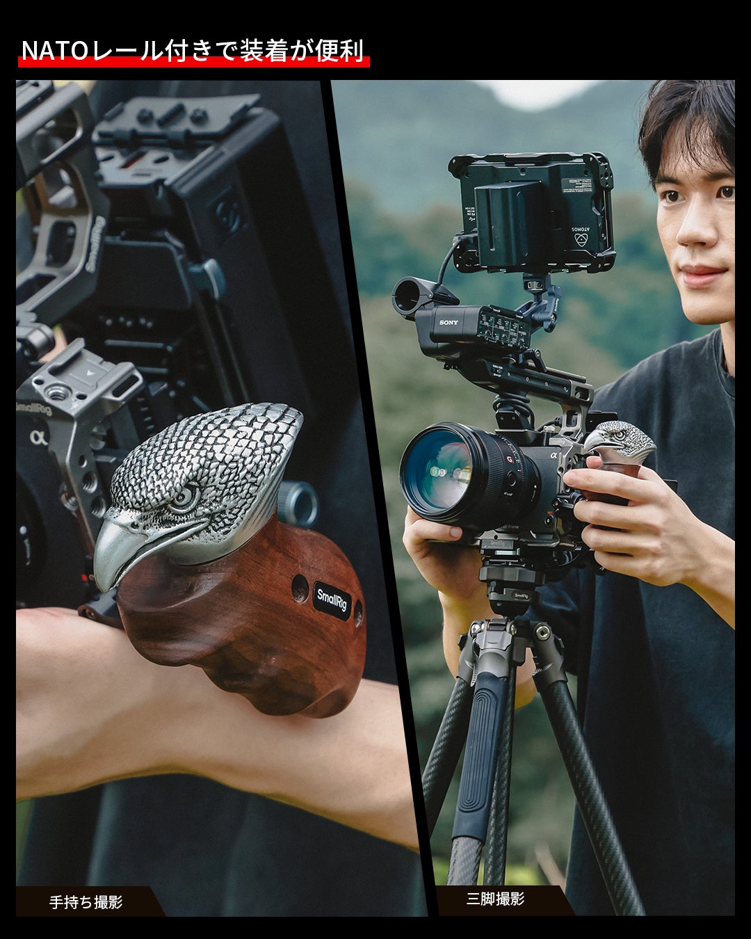 木製ハンドルは360度回転可能で、人間工学に基づいた曲線と自然な木肌の美しさを見事に融合し、NATOクランプとARRIロゼットの二つのバージョンが用意されています。