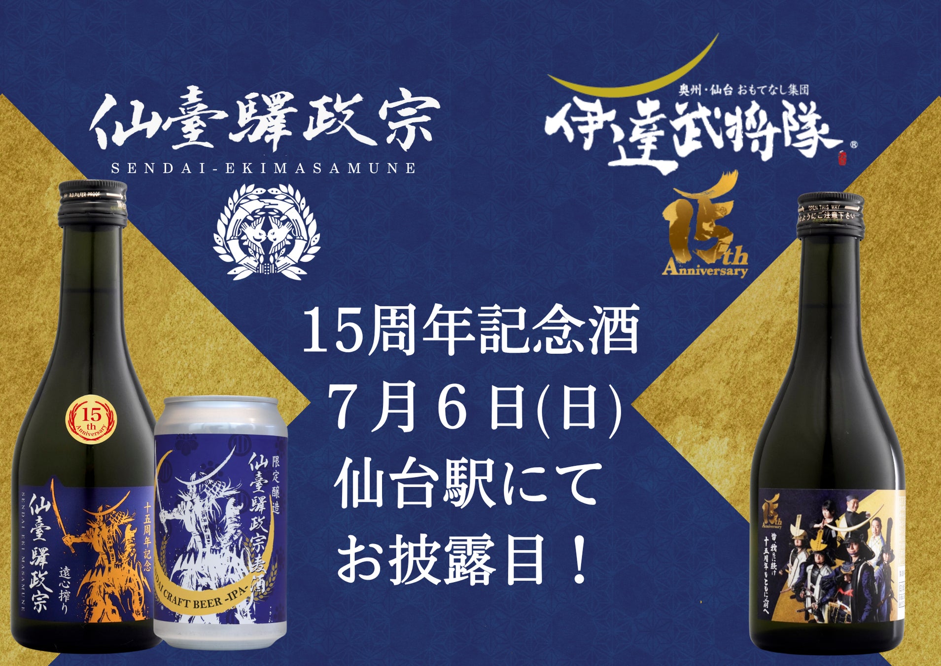 JR東日本東北総合サービス株式会社(本社:宮城県仙台市、代表取締役社長:弭間 俊則)は、7月6日(日)にJR仙台駅2F東西自由通路にて、仙台づくしの地酒「仙臺驛政宗」の発売15周年を記念し、新商品『仙臺驛政宗 純米吟醸 遠心搾り』・『仙臺驛政宗麦酒IPA(インディア・ペール・エール)』のお披露目イベントと販売会を開催します。