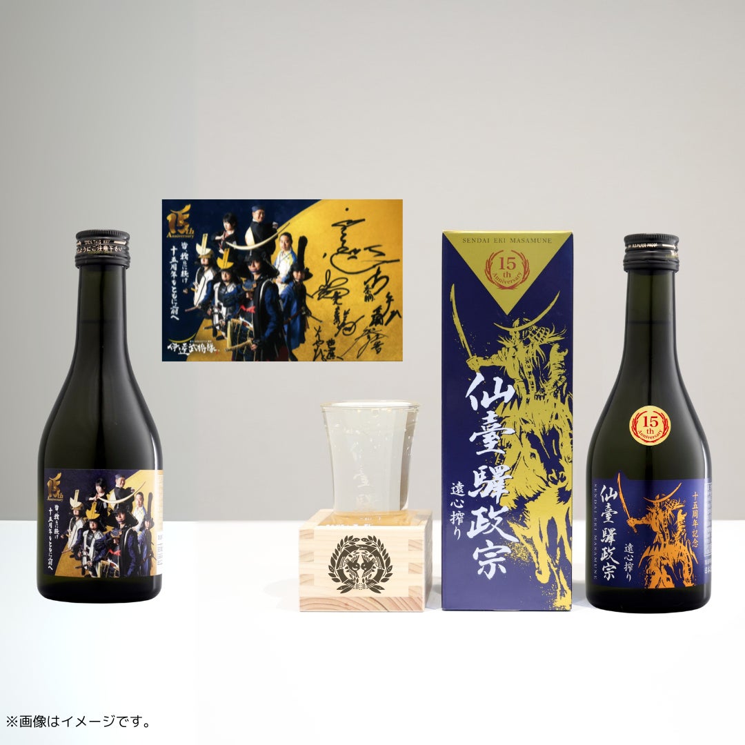伊達武将隊15周年を記念した撮り下ろし写真の特別なラベルの純米大吟醸です。パッケージには15周年の感謝を伝える武将隊からのメッセージも込められています。