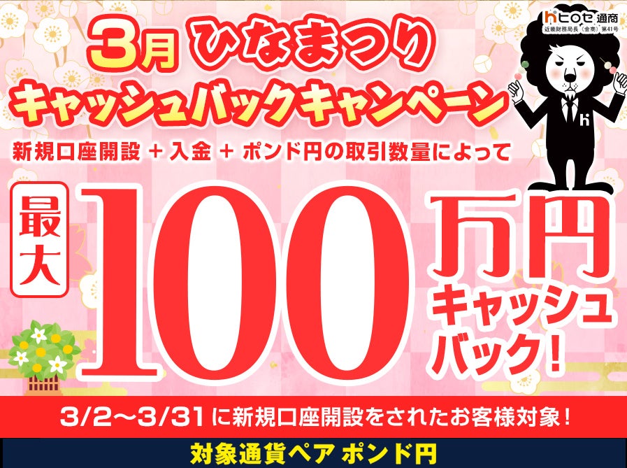 ヒロセ通商株式会社 (本社:大阪府西区、代表取締役:野市 裕作、以下:当社)は、当社の提供する「LION FX」において、2026年3月2日(月)より、「3月ひなまつ最大100万円キャッシュバックキャンペーン!」を実施いたしましたのでお知らせいたします。
